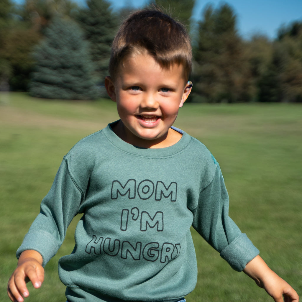 Tiny human, big appetite. This basil green pullover boldly declares “Mom, I’m Hungry”, perfect for the snack-time superstar of your household. Made from soft, breathable cotton.