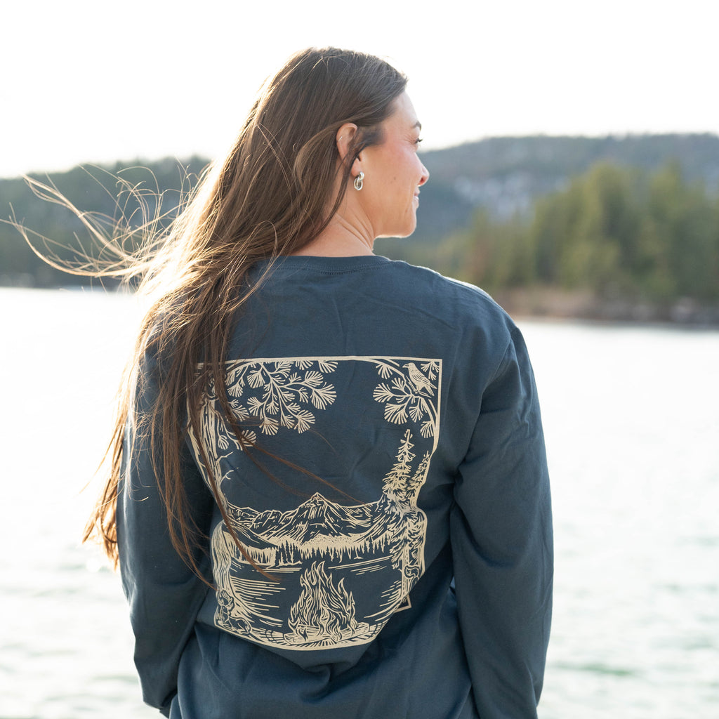 Cozy up in the outdoors (or just channel the feeling) with our Fireside Long Sleeve. This heavyweight, garment-dyed tee is made for crisp evenings and cooler days. Featuring a subtle campfire emblem on the front and a bold back graphic of a mountain view framed by pines and a glowing fire, it’s the perfect reminder of nights spent under the stars. Soft, durable, and designed for everyday wear—your go-to layer for fall adventures.