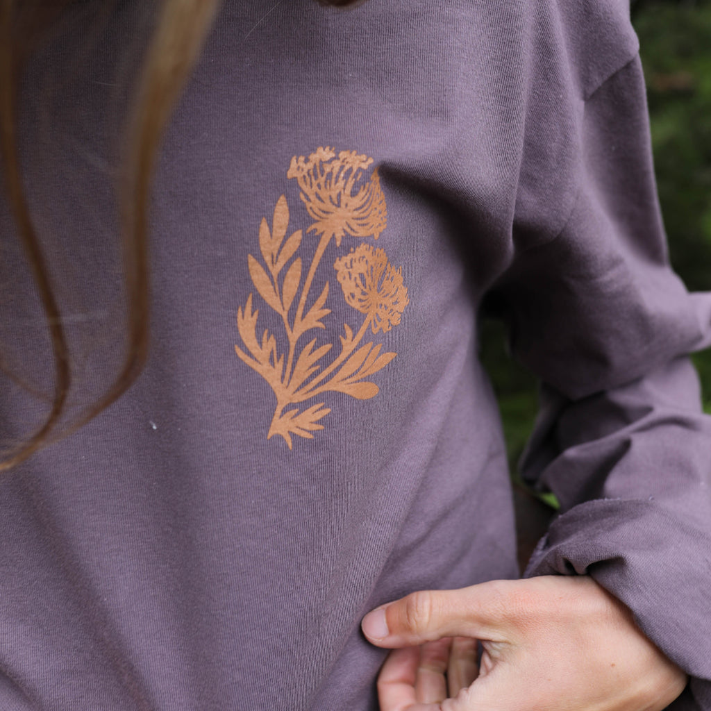 Inspired by open skies and endless trails, the Wild Field Long Sleeve brings a touch of the outdoors to your everyday wear. Made from soft, garment-dyed cotton in a rich storm purple color, it’s designed for comfort and effortless layering. With its nature-inspired graphic and lived-in feel, this tee is ready for campfires, weekend wanderings, and everything in between.
