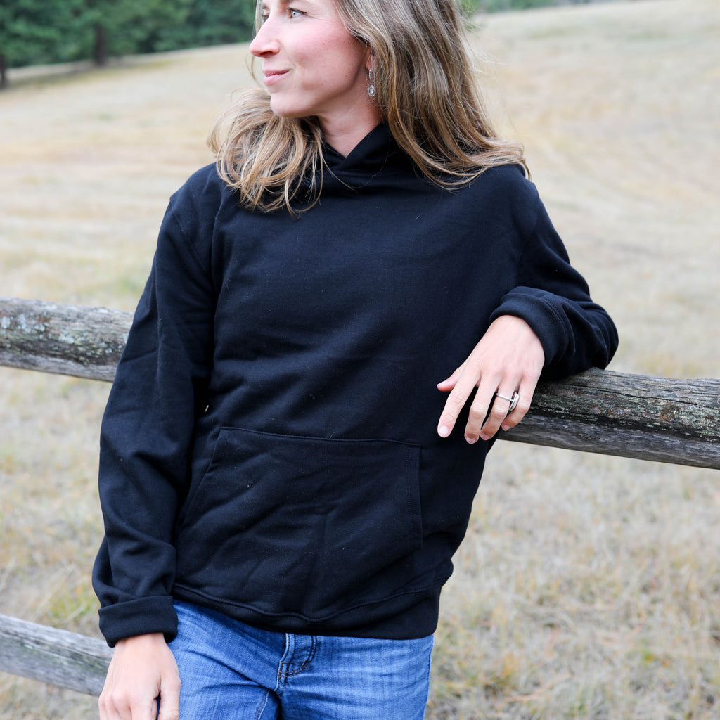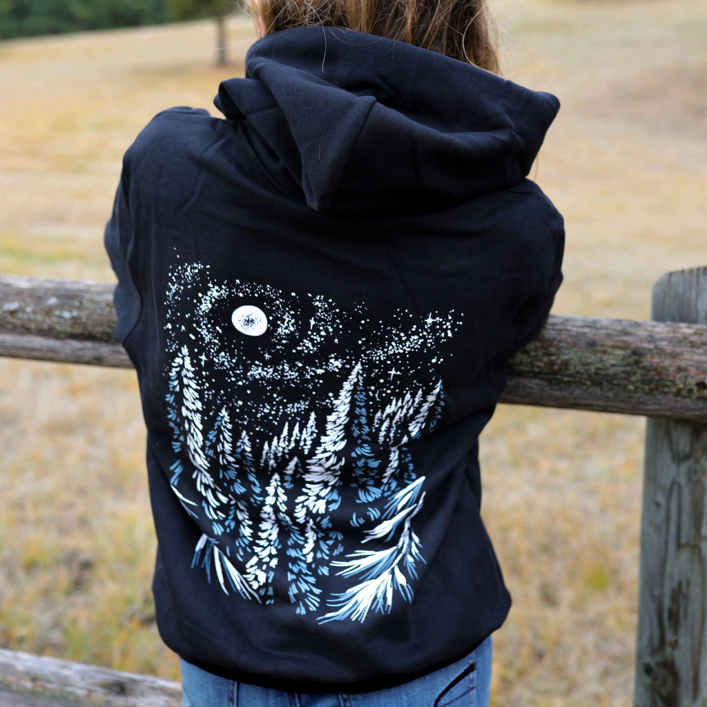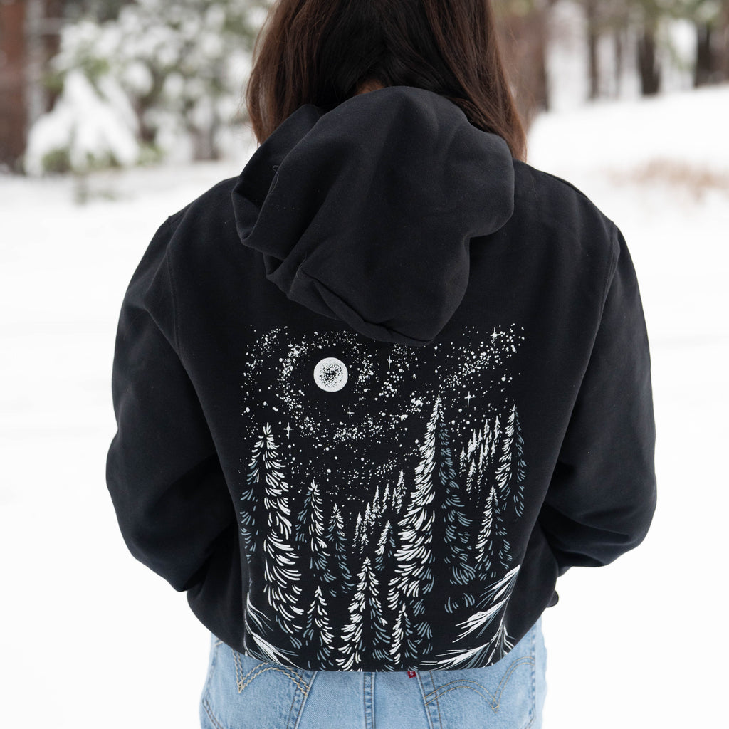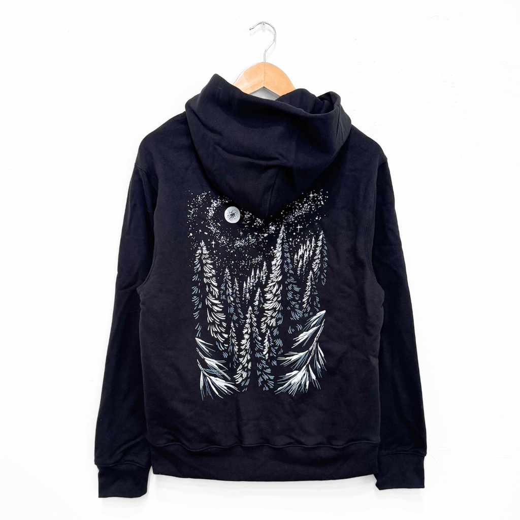 Cozy up in the calm of the woods. This unisex black hoodie features a striking winter forest design, a minimalist nod to nature’s quiet beauty. Crafted from a soft, heavy -weight cotton-blend fleece, it offers the perfect balance of warmth and comfort for chilly days, campfire nights, or just lounging indoors. (Front of hoodie is blank)