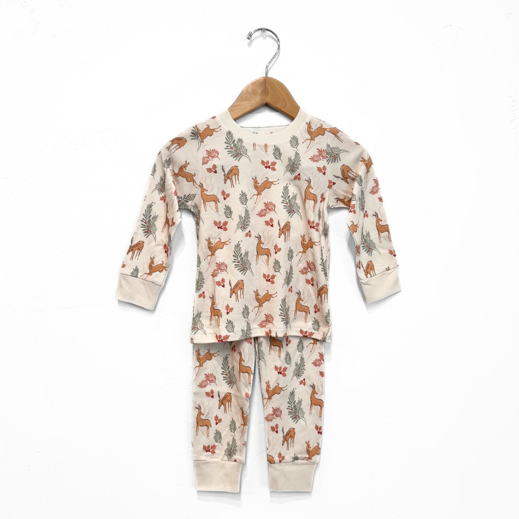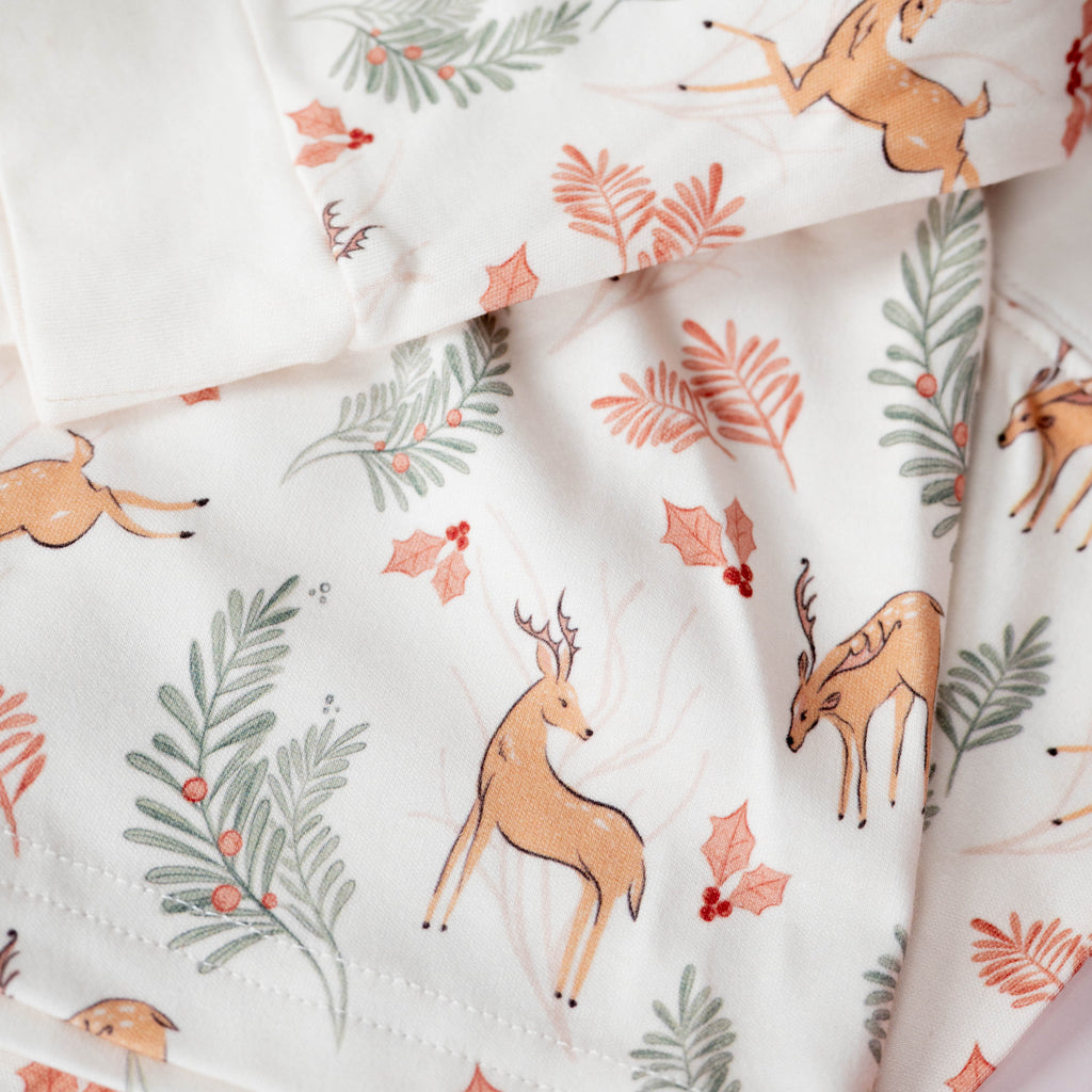 Crafted from a premium blend of 70% bamboo and 30% organic cotton, these 2 Piece Deer and Holly print PJ's offer exceptional softness and breathability. The natural fibers ensure moisture-wicking comfort and durability, making them ideal for restful nights and outdoor-inspired relaxation.
