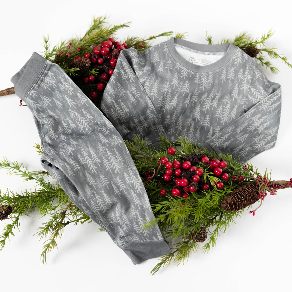 Crafted from a premium blend of 70% bamboo and 30% organic cotton, these 2 Piece Pine Trees print PJ's offer exceptional softness and breathability. The natural fibers ensure moisture-wicking comfort and durability, making them ideal for restful nights and outdoor-inspired relaxation.