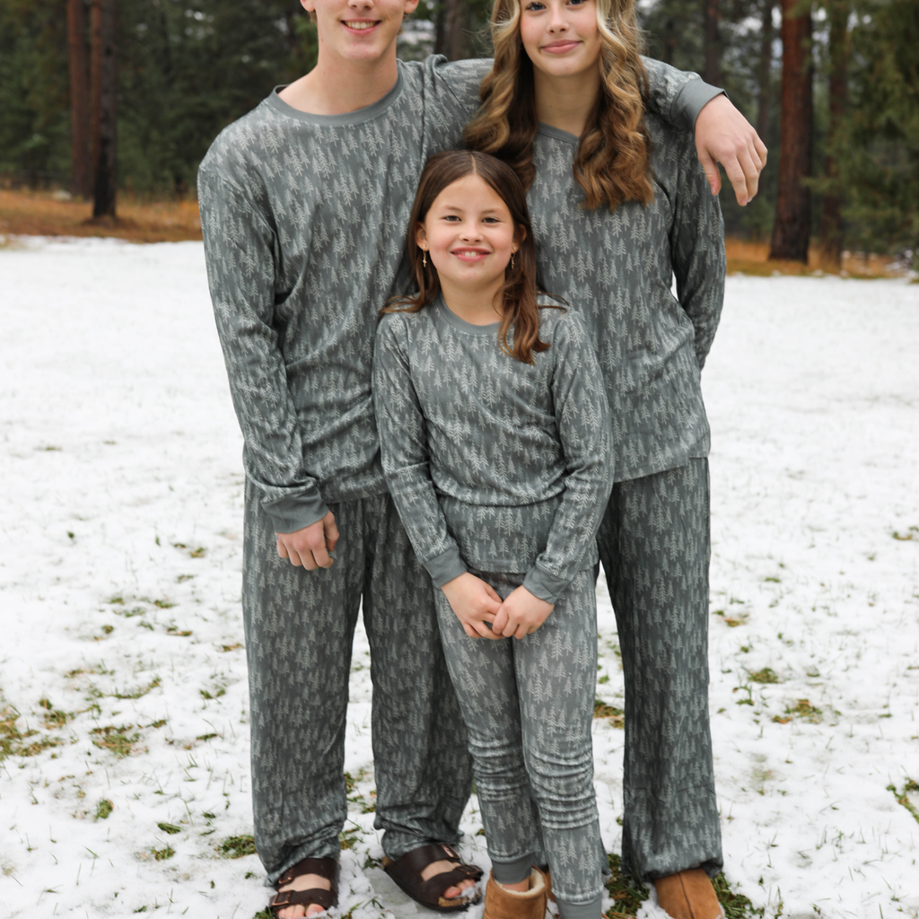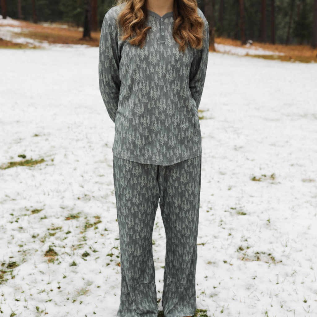 Escape to the forest every night in our Ladies Pine Trees Pajama Set. Crafted from 30% organic cotton and 70% bamboo, these pajamas offer the best of both worlds: bamboo's incredible moisture-wicking and temperature-regulating properties keep you comfortable through the night, while organic cotton ensures softness and durability. Slip into comfort and let the forest lull you to sleep.