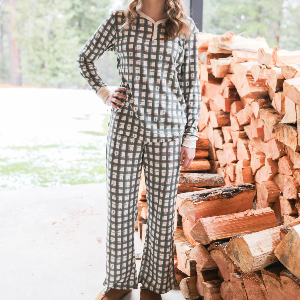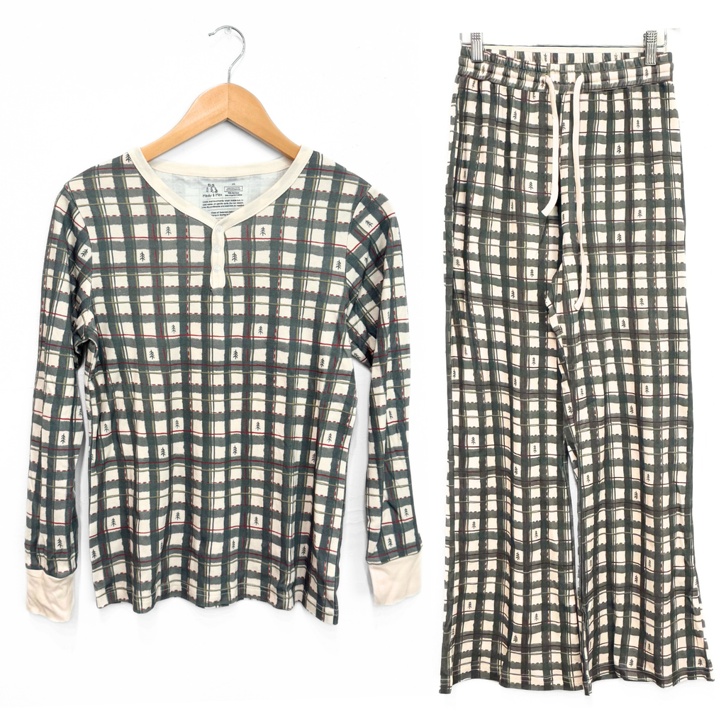 Snuggle into holiday cheer with this cozy plaid pajama set designed for comfort and style. Crafted from a luxurious blend of 30% organic cotton and 70% bamboo. Bamboo's natural breathability means you'll stay comfortable year-round, while the organic cotton adds durability and peace of mind. Treat yourself to pajamas that feel as good as they look.