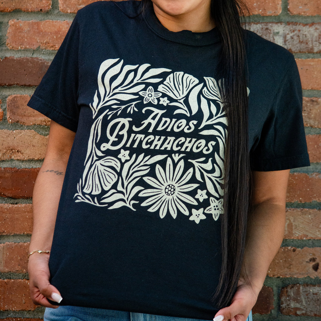 This t-shirt features a bold, playful design perfect for making a statement. The shirt is black with a cream floral graphic on the front, framing the phrase “Adios Bitchachos” in a stylized, vintage-inspired script. The floral pattern adds a boho, tropical flair while the text gives it a cheeky, irreverent twist. Great for casual wear, parties, or vacations, this tee combines humor with standout visual appeal.
