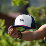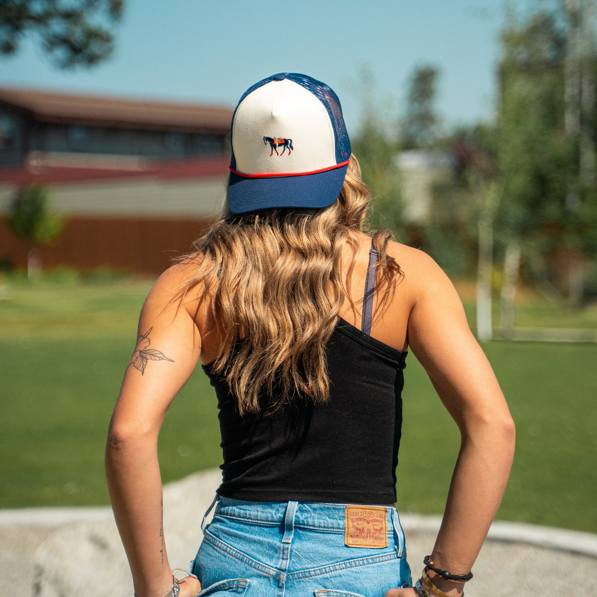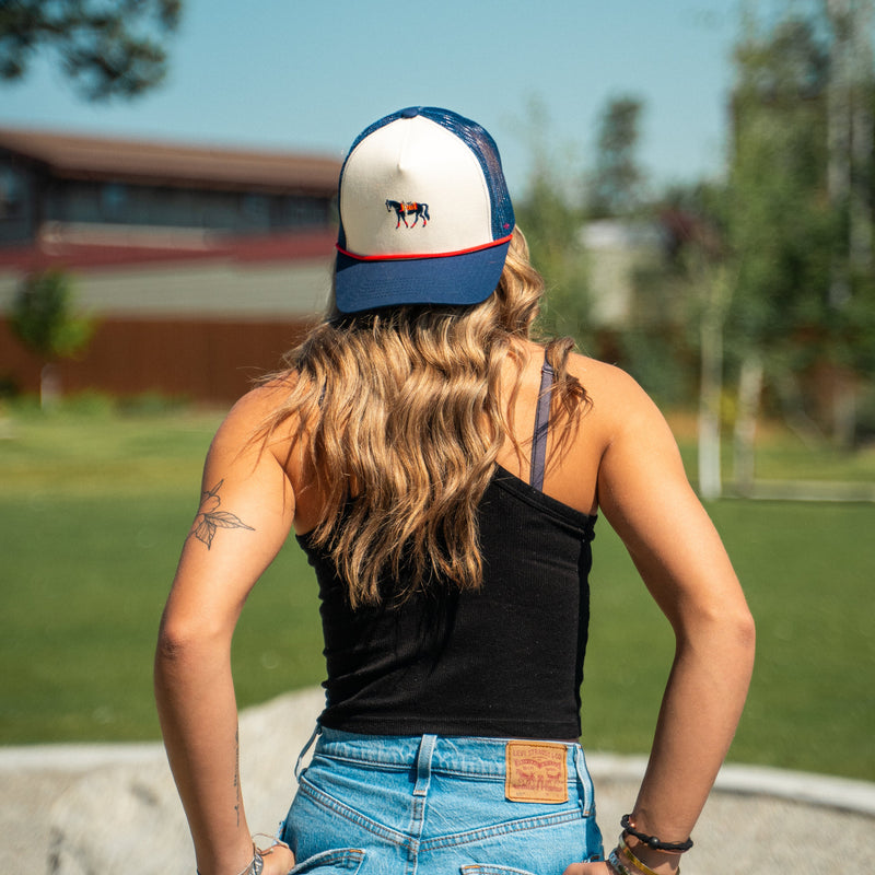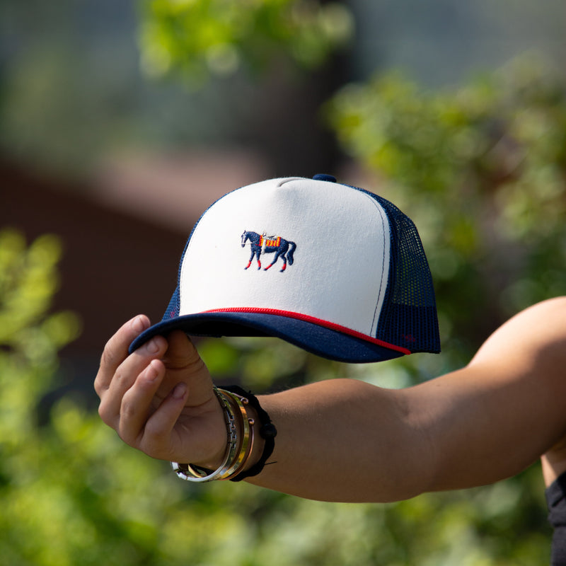 Classic western charm meets everyday wear. This snapback trucker features a cream front panel with a richly embroidered saddle horse, paired with a navy mesh back for breathable comfort. A red rope adds a bold pop of contrast, making this hat stand out whether you're in the saddle or hitting the streets. Adjustable snapback closure ensures a perfect fit.