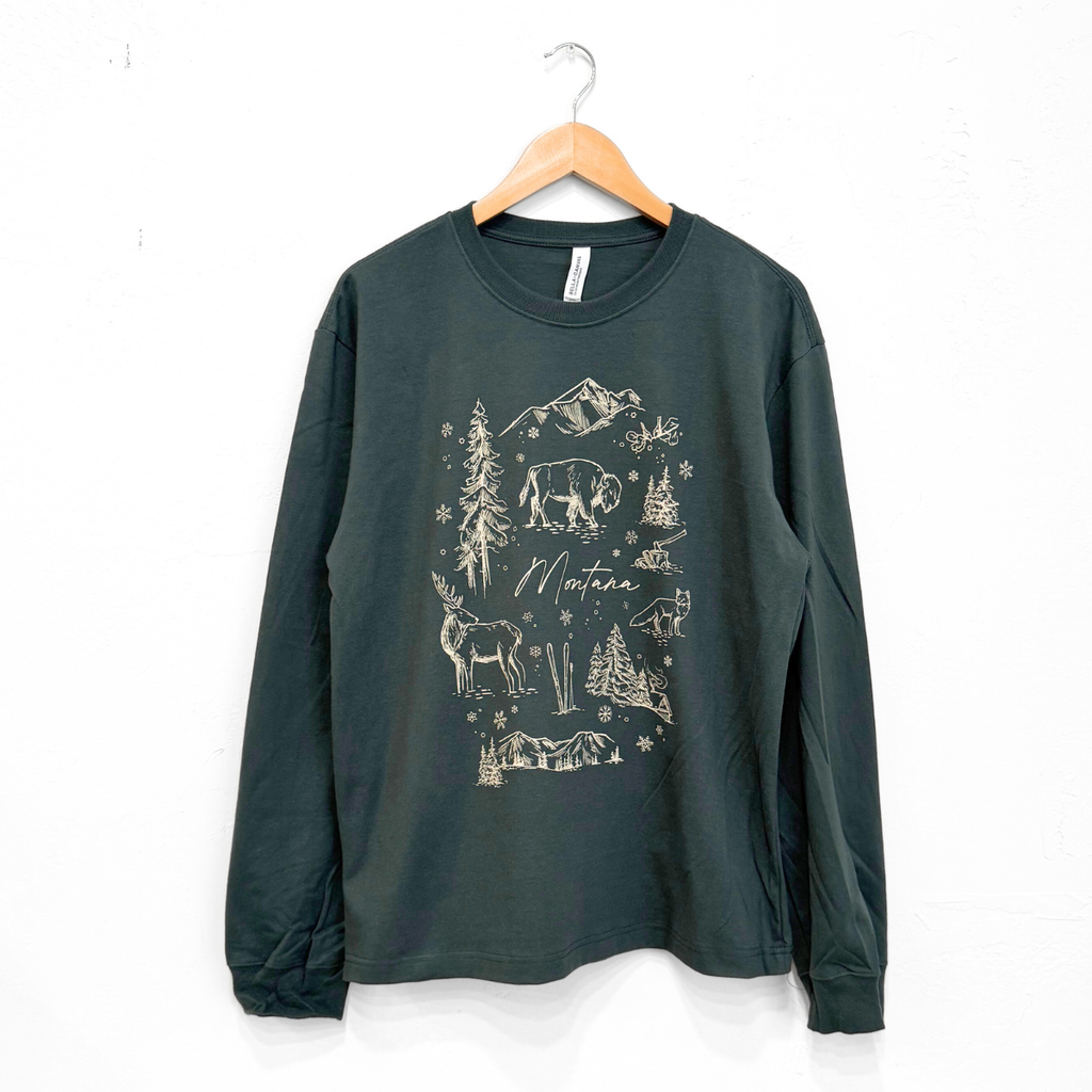 Cozy up for the season in our Winter Wilderness long sleeve. Crafted from premium heavyweight cotton, this tee offers a structured feel with extra warmth for crisp mountain mornings. The rich hunter green hue pairs perfectly with its outdoors-inspired design — a nod to quiet trails, snow-dusted pines, and Montana winters. Built for comfort and durability, it’s the perfect layer for all your cold-weather adventures.